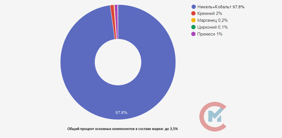В состав основных элементов никелевой марки НКМ входят никель и кобальт, с процентным соотношением до 97,8%, кремний от 2 до 4%, марганец от 0,2 до 1% и цирконий до 0,1%. По ТУ 48-21-256 допускается добавление различных примесей до 1%.